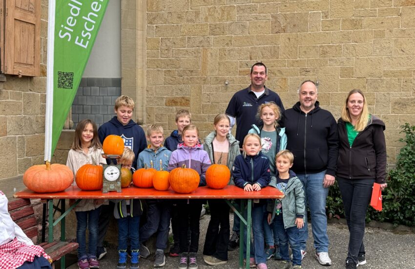 Die jungen „Kürbis-Könige“ stellten sich zusammen mit ihren Produkten und der Vorstandschaft der Siedlergemeinschaft stolz dem Fotografen